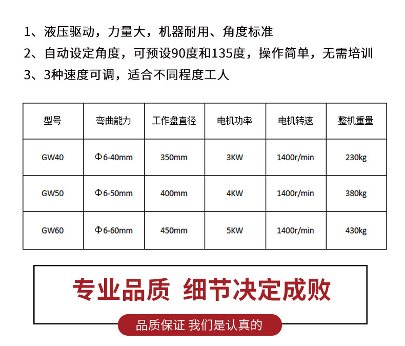 産品特點液壓驅動,力量大(dà),機器(qì)耐用、角度标準自動設定角度,可(kě)預設90度和(hé)135度,操作(zuò)簡單,無需培訓3種速度可(kě)調,适合不同程度工人(rén)