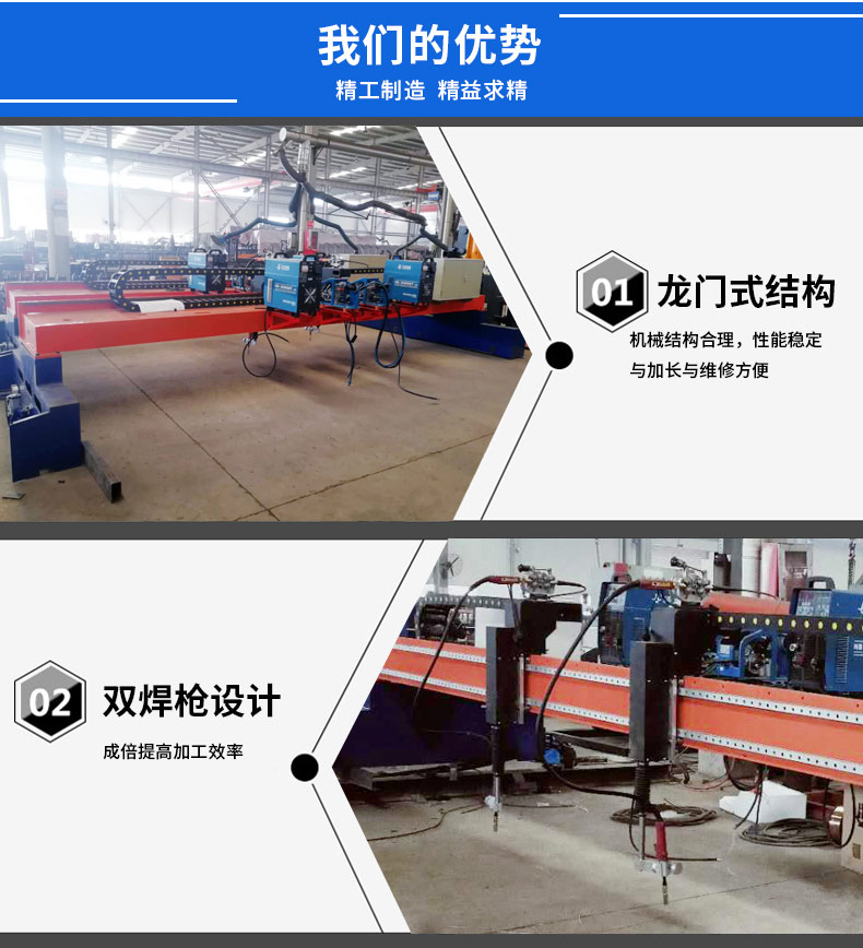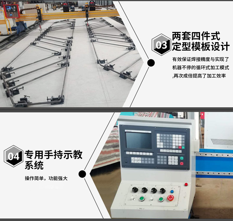 獨創的龍門(mén)式結構;機械結構合理(lǐ),性能穩定與加長與維修方便;雙焊設計(jì);成倍提高(gāo)加工效率;兩套四件式定型模闆設計(jì);有(yǒu)效保證焊接精度與實現了機器(qì)不停的循環式加工模式;再次成倍提高(gāo)了加工效率。公司開(kāi)發的焊接機器(qì)人(rén)專用手持示教系統:操作(zuò)簡單,功能強大(dà)。
