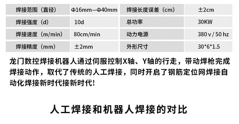 随着我國經濟的迅速發展,生産周期在不斷地縮短(duǎn),焊接自動化、焊接質量要求不斷地提高(gāo),使得(de)數控鋼筋加工裝備替代傳統手工加工及半自動機械加工鋼筋成為(wèi)必然趨勢。到目前為(wèi)止,國內(nèi)蓋梁骨架片焊接工作(zuò)90%以上(shàng)都是由人(rén)工焊接完成。存在效率低(dī)下,質量不可(kě)控,工人(rén)勞動強度高(gāo)與身體(tǐ)傷害嚴重。公司在這樣的市場(chǎng)環境下研發出國內(nèi)一台龍門(mén)式蓋梁骨架片焊接機器(qì)人(rén),同時(shí)開(kāi)啓了蓋梁鋼筋骨架片自動化焊接新時(shí)代!